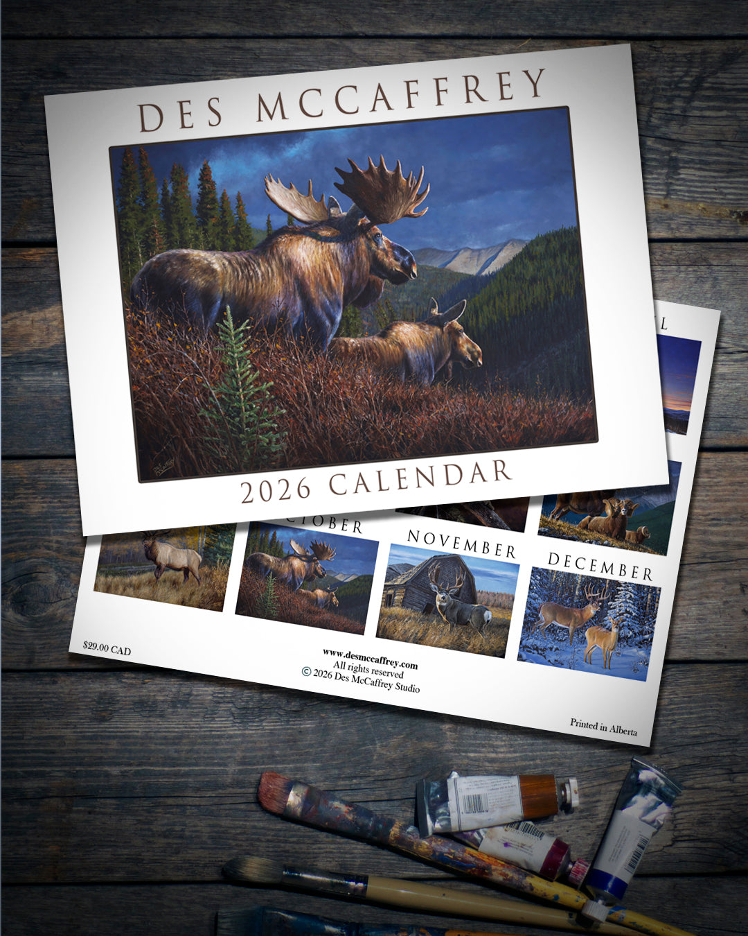 These fine art greeting cards feature some of Des McCaffrey’s most beloved wildlife paintings, elk, moose, deer, and wolf celebrating the landscapes and animals that define the Canadian wilderness.